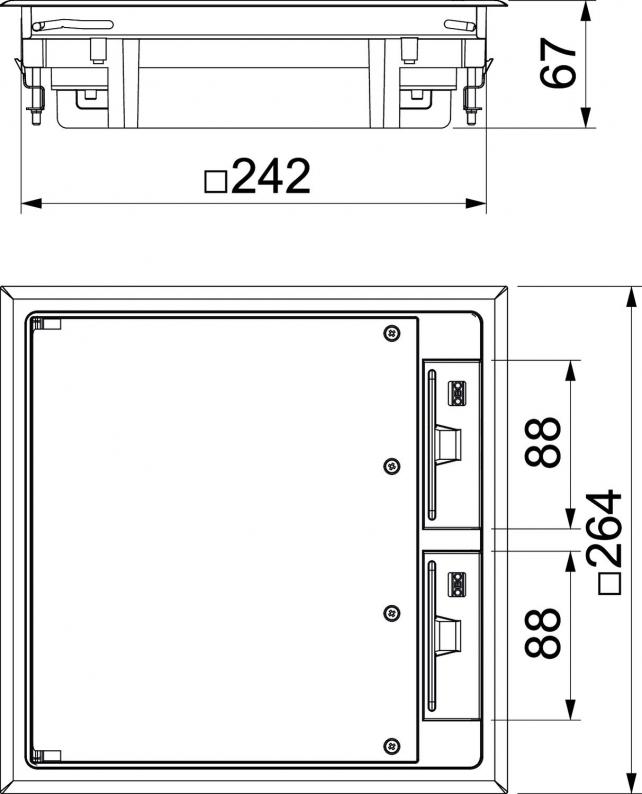 Square flushfloor installation unit for mounting in an OKA-T trunking system. With mounting support to accept up to three APMT5 cover plates.