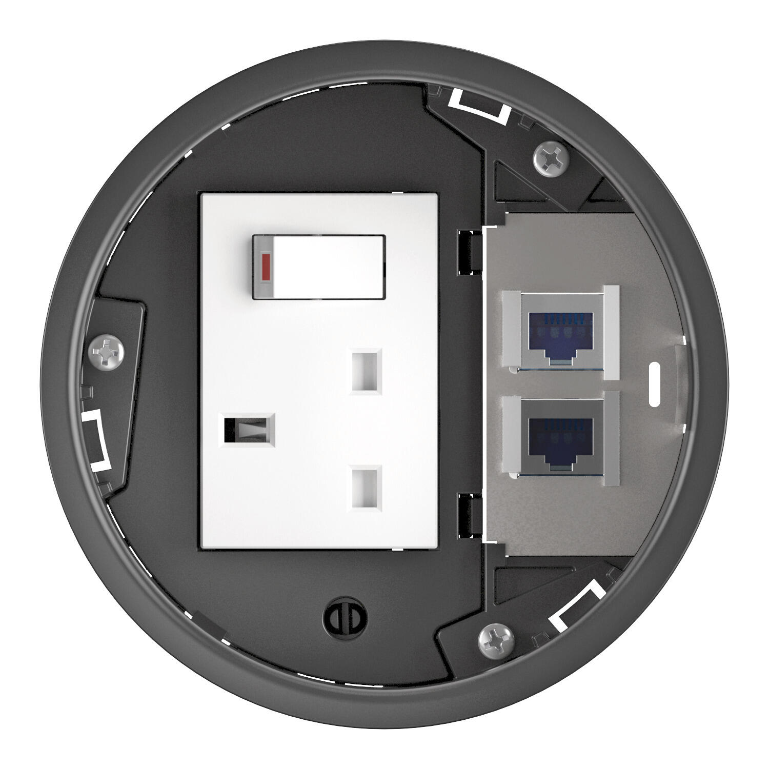 The installation socket is available empty or pre-equipped. The pre-equipped variant contains either a double socket or a freely selectable combination of two single Modul 45 units. The installation socket pre-equipped with the double socket is particularly suited for standard applications. The variant for the two single Modul 45 units provides even more installation flexibility. In this variant, the installation space is disjoined – this allows simultaneous installation of two sockets and two multimedia connections such as HDMI, VGA or data technology.