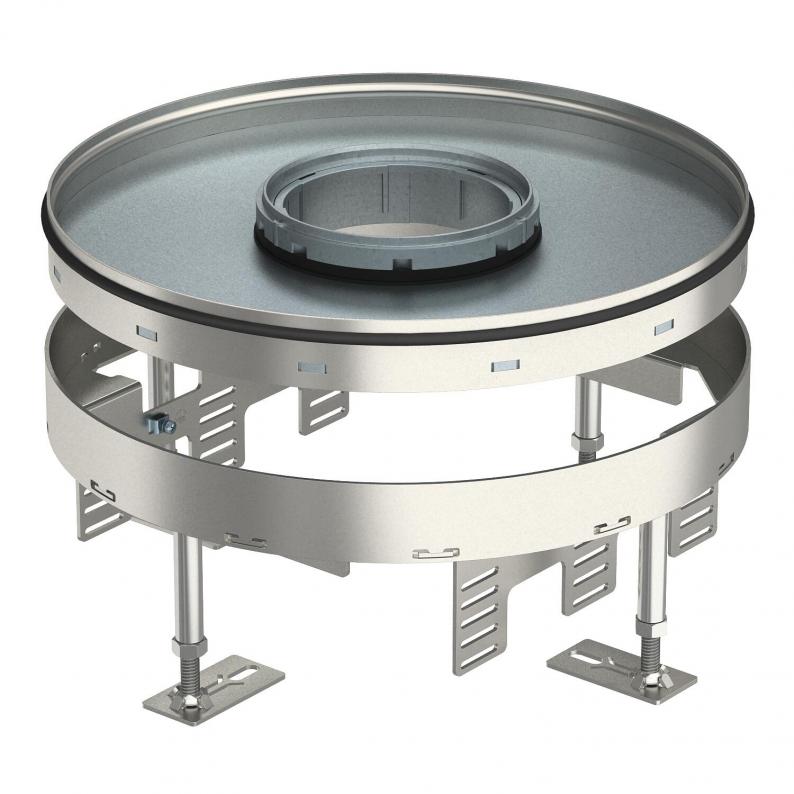 Height-adjustable round cassette, 3-compartment, for tube bodies of nominal size 9 for the intallation of accessories. Cassette for the use in trunking systems and in raised and cavity floors in dry- or wet-cleaned floors in indoor areas.