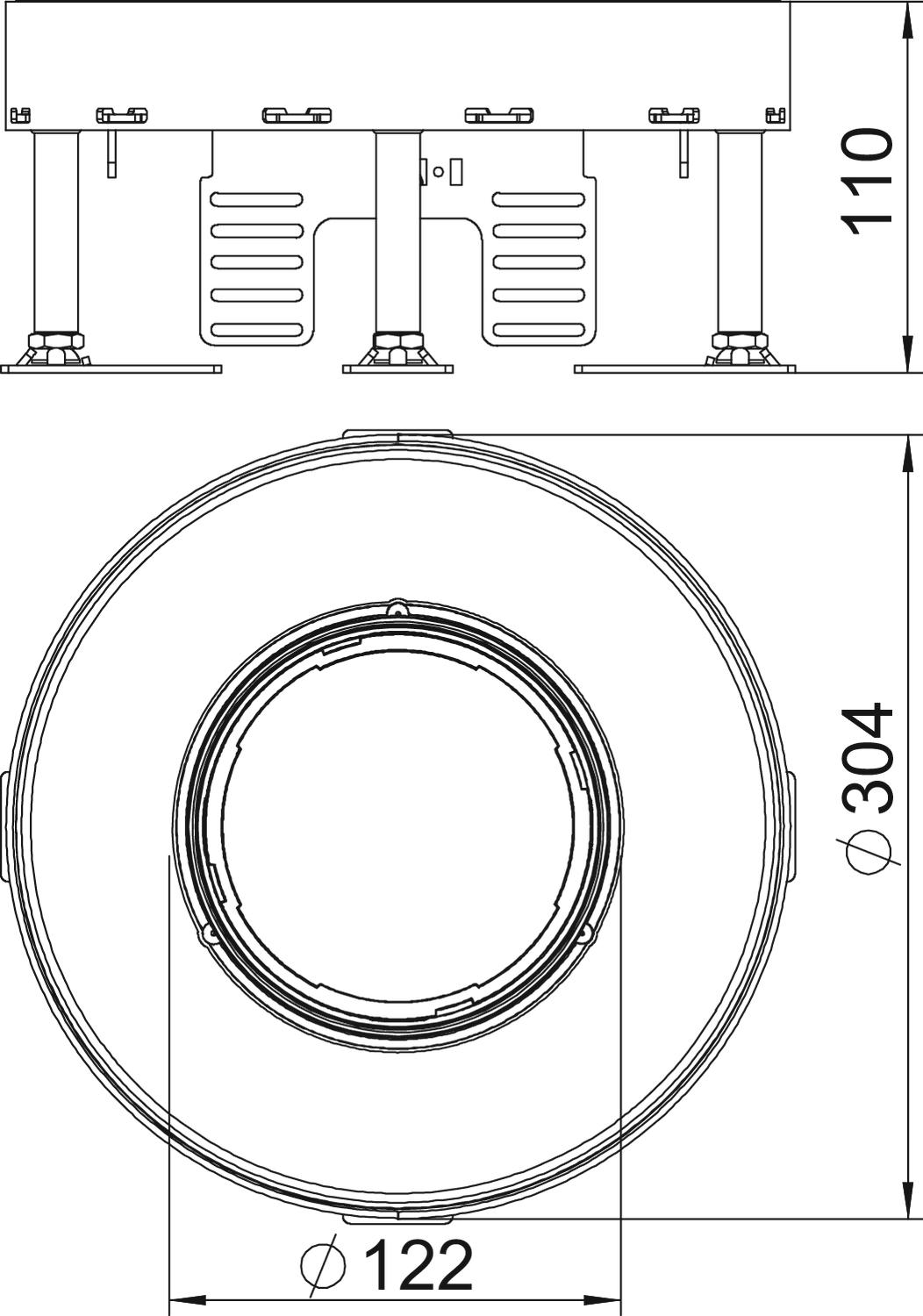 Height-adjustable round cassette, 3-compartment, of nominal size 9, for tube bodies. For the installation in trunking systems and in raised and cavity floors in dry- or wet-cleanded floors in indoor areas. Load class 2 to 20 kN. Three cover plates APMT5 can be installed.