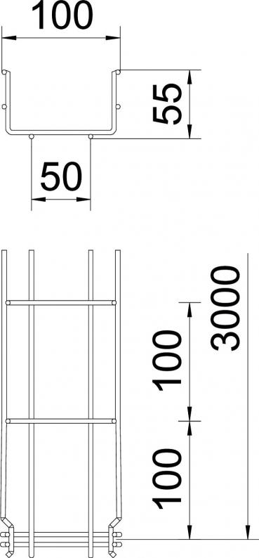 No additional connection components are required for the mesh cable tray, it is simply interlocked. The grid width is 50 x 100 mm (exception: GRM 55/50 = 20 x 100 mm). Tested for the maintenance of electrical function according to DIN 4102 Part 12 (type: GRM 55 200 4.8 G, GRM 55 300 G, GRM 55 400 G, mounting work and parameters according to valid test certificate).