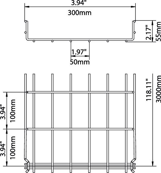 No additional connection components are required for the mesh cable tray, it is simply interlocked. The grid width is 50 x 100 mm (exception: GRM 55/50 = 20 x 100 mm). Tested for the maintenance of electrical function according to DIN 4102 Part 12 (type: GRM 55 200 4.8 G, GRM 55 300 G, GRM 55 400 G, mounting work and parameters according to valid test certificate).
