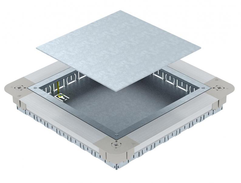 Underfloor accessory box with mounting lid and lid blanking plate with sheet steel side walls. For the installation of a square GES9 55 service outlet in screed heights of 55 mm or more. Height can be infinitely adjusted to the nominal screed height and the screed can be worked flush to the screed scraping edge. With 7 x M20, 3 x M25, 4 x M32 pipe insertion openings on each side. Usable pipe size at a system height of 55 mm: M20.