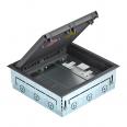 Square screed socket with GES9 UGE service outlet for use in screed floors in indoor areas. With pre-marked insertion openings for pipelines (M25) on all four sides. The delivery includes a cover plate APMT5 blank and a cover plate for 4 data connections of type LUJ6C as well as 1 cover plate APMT5 with double socket switched The minimum installation depth is 64 mm, the height-adjustment range +23 mm.